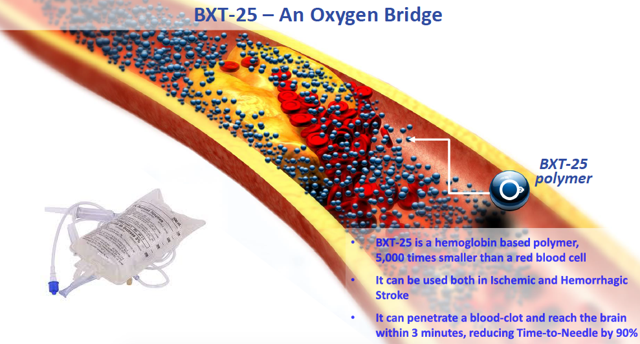 It lead drug candidate BXT-25 , a haemoglobin based polymer, that is 5000 times smaller than a red blood cell, can penetrate a blood-clot and reach the brain within 3 minutes. Its FDA approved OXYSENSE Technology allows it to measure oxygen delivery to brain in real-time. BXT-251 , another drug candidate aims to prolong extracorporeal circulation in cases of organ donations that can help them preserve organs for days rather than hours.