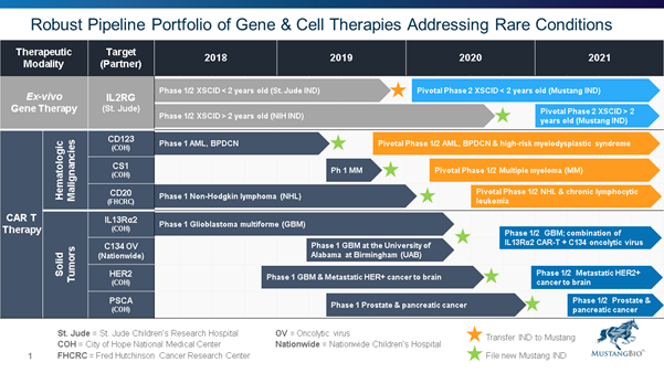 In addition to MB-107, its X-SCID Gene Therapy program, it is also developing CD-123 or MB-102 and adaptive cellular immunotherapy in AML and BPDCN, a form of rare aggressive blood cancer. Its CD20 or MB-106 is an Immunotherapy program for B-Cell Non-Hodgkin Lymphoma. Additionally it is also developing CS1 or MB-104 Multiple Myeloma, IL-13Rα2 or MB-101 for the treatment of Glioblastoma (GBM), HER2 or MB-103 for Glioblastoma Multiforme, PSCA or MB-105, a prostate stem cell antigen for Prostate, Pancreatic, Gastric & Bladder Cancers and C134 or MB-108 a next-generation oncolytic herpes simplex virus (“oHSV”).