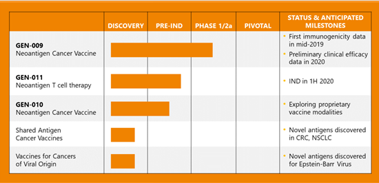 Additionally, it is developing GEN-011, a neoantigen T cell therapy for which the company plans to file for an IND in the first half of 2020. It has also discovered certain unique antigens for Epstein-Barr virus.