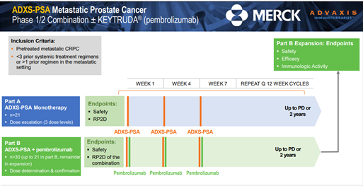 Advaxis lead candidate for the treatment of prostate cancer is ADXS-PSA, which is currently being evaluated in Phase I/2 clinical trials for metastatic castration-resistant prostate cancer (mCRPC), both as a monotherapy and in combination with Merck’s PD-1 checkpoint inhibitor KEYTRUDA® (pembrolizumab).