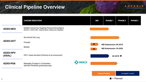 Its proprietary formulation of attenuated Lm is licensed from the University of Pennsylvania. ADXS-HOT, its program that targets common or mutation tumor driver genes focuses on somatic mutations, cancer testis antigens and oncofetal antigens. It intends to develop “off the shelf” and ready to administer products through its program. The company has already received an investigational new drug approval for ADXS-503, indicated for the treatment of Non Small Cell Lung Cancer in February 2019. It is in preparation for filing an IND for prostate and bladder cancer as well.