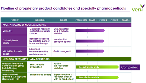 Veru has been issued 7 compositions of matter patents that offer it protection until 2034 in the U.S along with 63 foreign granted or pending patents worldwide. It is also developing Zuclomiphene, which if approved, will be the first FDA approved drug for hot flashes caused by prostate cancer hormone therapy.