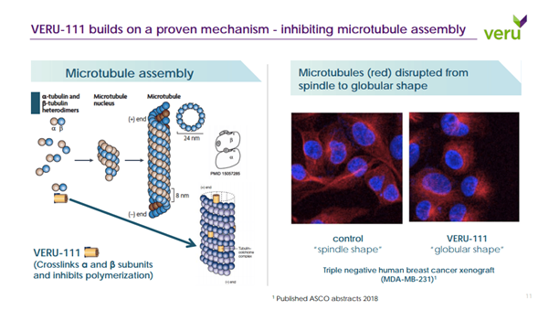 An oncology and urology focused biopharmaceutical company; Veru is developing VERU-111, a first-in-class oral selective antitubulin, targeted at refractory metastatic prostate cancer. It works by inhibiting the microtubule assembly by selective binding and targeting of α and β subunits of microtubules. It is currently undergoing an open label l Phase 1b/2 clinical study at Johns Hopkins Cancer Center and 4 other centers.